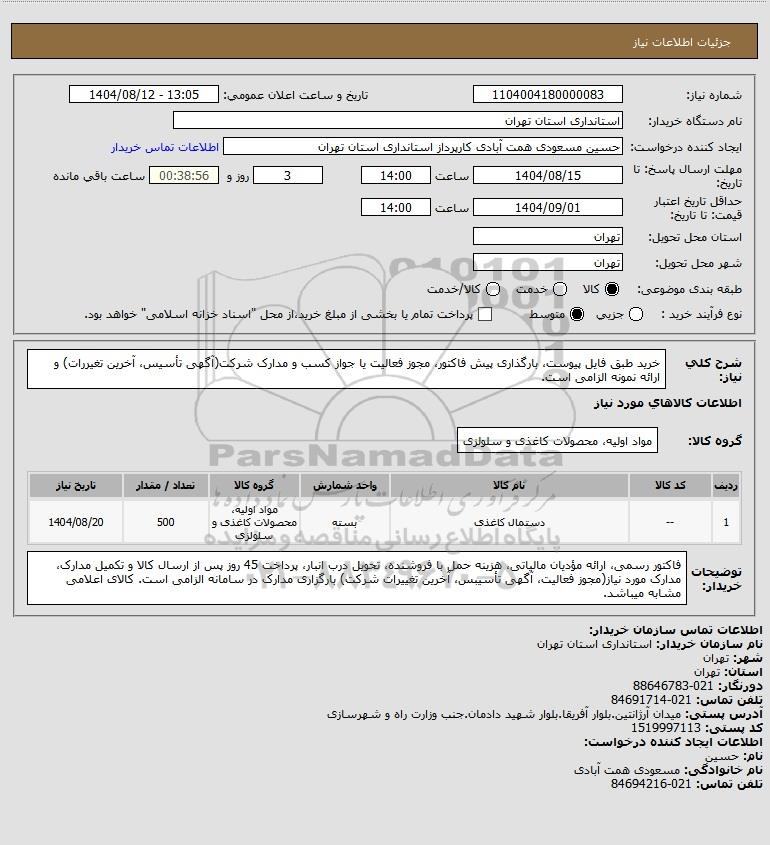 | 1 | -- | دستمال کاغذی | بسته | مواد اولیه، محصولات کاغذی و سلولزی | 500 | 1404/08/20 |