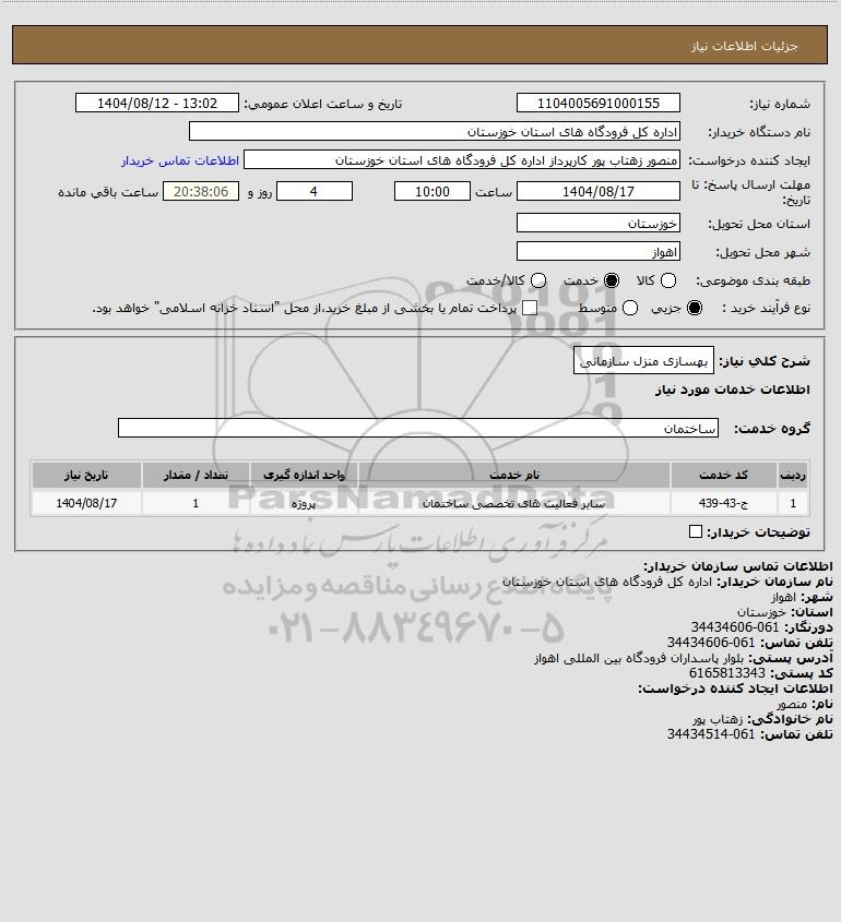 شرح کلی نیاز: بهسازی منزل سازمانی