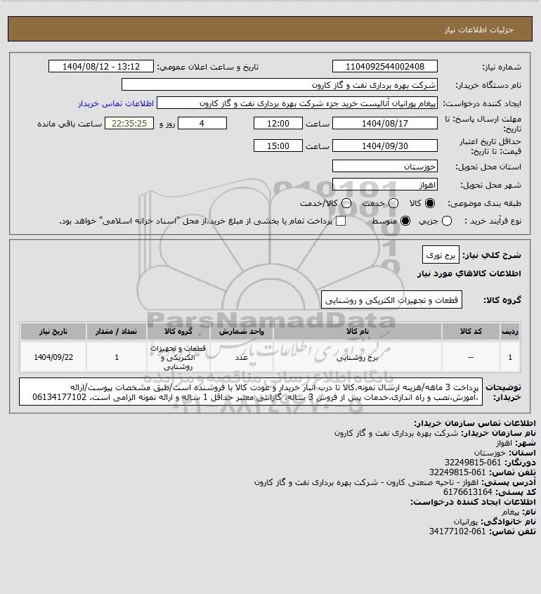 | 1 | -- | برج روشنایی | عدد | قطعات و تجهیزات الکتریکی و روشنایی | 1 | 1404/09/22 |