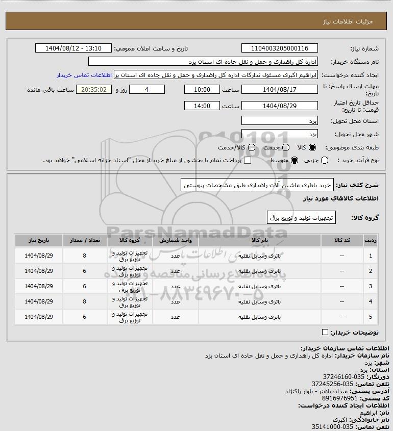 | 5 | -- | باتری وسایل نقلیه | عدد | تجهیزات تولید و توزیع برق | 6 | 1404/08/29 |