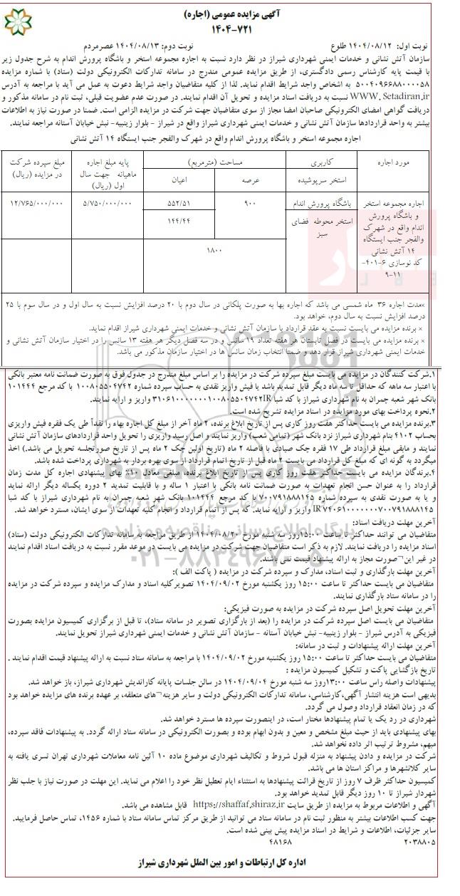 سازمان آتش نشانی و خدمات ایمنی شهرداری شیراز در نظر دارد نسبت به اجاره مجموعه استخر و باشگاه پرورش اندام به شرح جدول زیر با قیمت پایه کارشناس رسمی دادگستری از طریق مزایده عمومی مندرج در سامانه تدارکات الکترونیکی دولت (ستاد) با شماره مزایده 5004096688000058 به اشخاص واجد شرایط اقدام نماید. لذا از کلیه متقاضیان واجد شرایط دعوت به عمل می آید با مراجعه به آدرس ستاد ایران نسبت به دریافت اسناد مزایده و تحویل آن اقدام نمایند. در صورت عدم عضویت قبلی ثبت نام در سامانه مذکور و دریافت گواهی امضای الکترونیکی صاحبان امضا مجاز از سوی متقاضیان جهت شرکت در مزایده الزامی است. ضمنا در صورت نیاز به اطلاعات بیشتر به واحد قراردادها سازمان آتش نشانی و خدمات ایمنی شهرداری شیراز واقع در شیراز