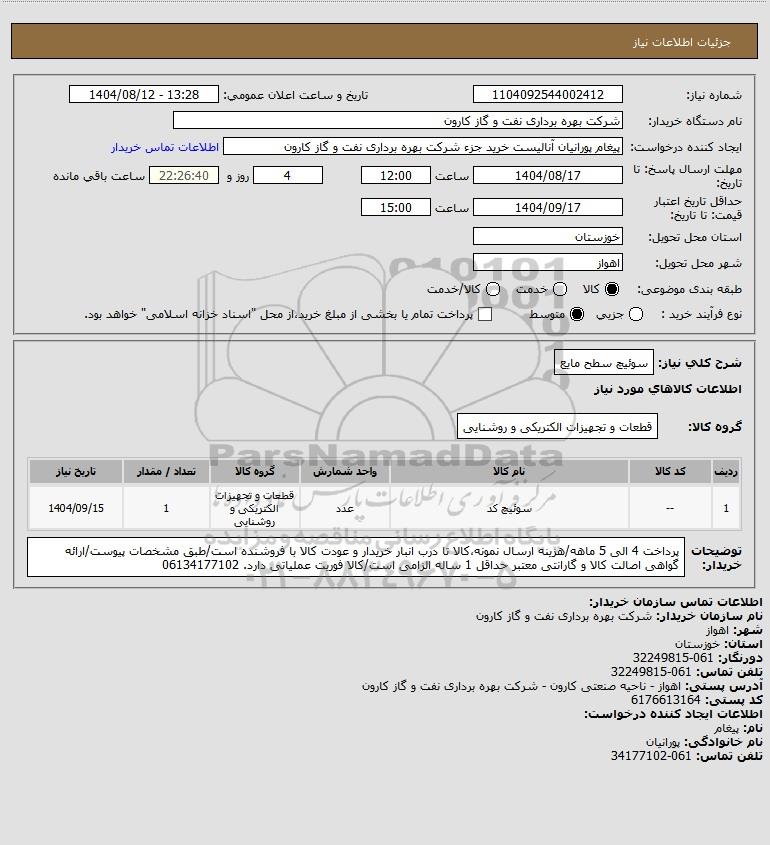| 1 | -- | سوئیچ کد | عدد | قطعات و تجهیزات الکتریکی و روشنایی | 1 | 1404/09/15 |