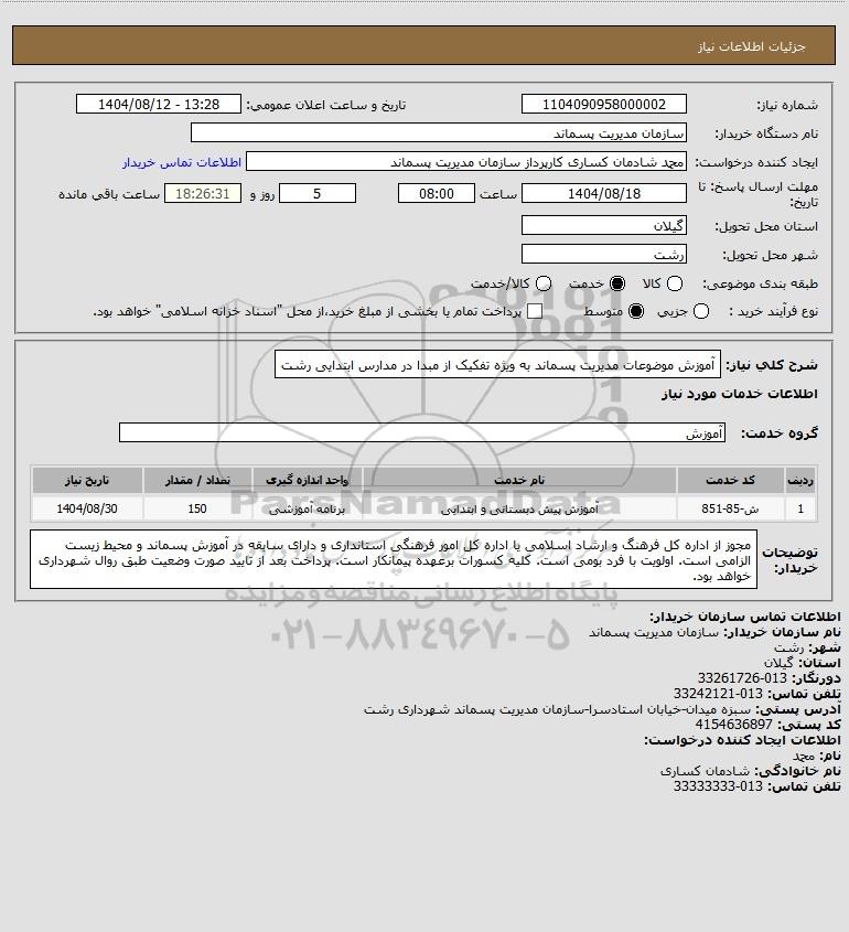 استعلام آموزش موضوعات مدیریت پسماند به ویژه تفکیک از مبدا در مدارس ابتدایی رشت, استعلام آموزش موضوعات مدیریت پسماند به ویژه تفکیک از مبدا در مدارس ابتدایی رشت