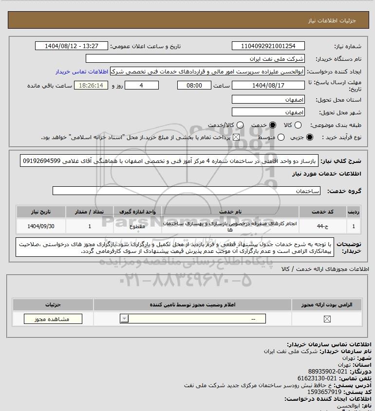 شرح کلی نیاز: بازساز دو واحد اقامتی در ساختمان شماره 4 مرکز آموز فنی و تخصصی اصفهان با هماهنگی آقای غلامی 09192694599