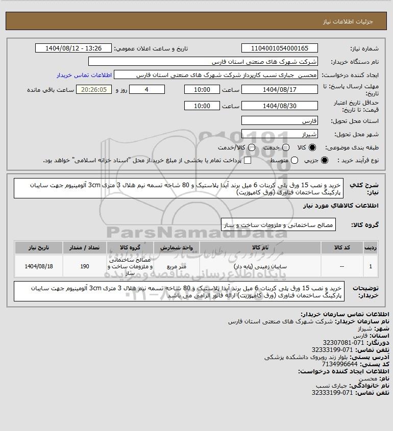 شرح کلی نیاز: خرید و نصب 15 ورق پلی کربنات 6 میل برند آیدا پلاستیک و 80 شاخه تسمه نیم هلال 3 متری 3cm آلومینیوم جهت سایبان پارکینگ ساختمان فناوری (ورق کامپوزیت)