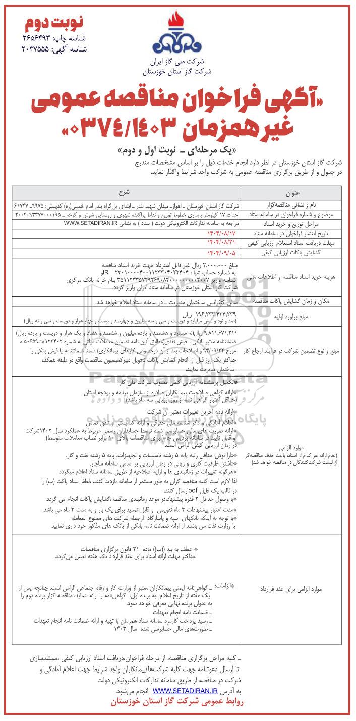 موضوع و شماره فراخوان در سامانه ستاد: احداث 17 کیلومتر پایداری خطوط توزیع و نقاط پراکنده شهری و روستایی شوش و کرخه - 2004093377000195