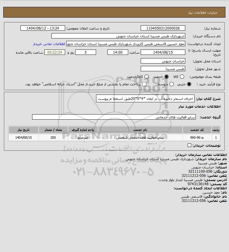 شرح کلی نیاز: اجرای استخر ذخیره آب در ابعاد *4*5*20طبق استعلا م پیوست