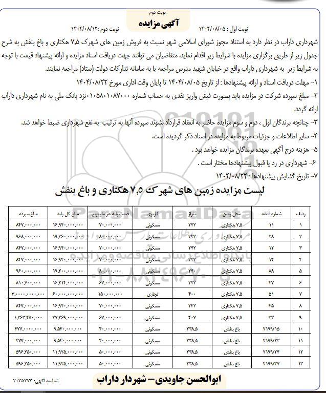شهرداری داراب در نظر دارد به استناد مجوز شورای اسلامی شهر نسبت به فروش زمینهای شهرک 7.5 هکتاری و باغ بنفش به شرح جدول زیر از طریق برگزاری مزایده با شرایط زیر اقدام نماید متقاضیان میتوانند جهت دریافت اسناد مزایده و ارائه پیشنهاد قیمت با توجه به شرایط زیر به شهرداری داراب واقع در خیابان شهید مدرس مراجعه یا به سامانه تدارکات دولت (ستاد) مراجعه نمایند.