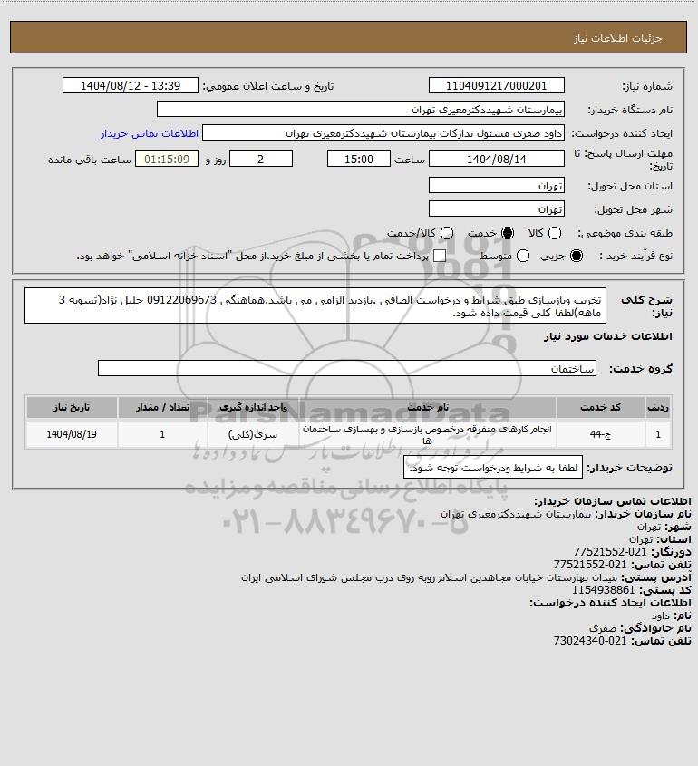 شرح کلی نیاز: تخریب وبازسازی طبق شرایط و درخواست الصاقی .بازدید الزامی می باشد.هماهنگی 09122069673 جلیل نژاد(تسویه 3 ماهه)لطفا کلی قیمت داده شود.