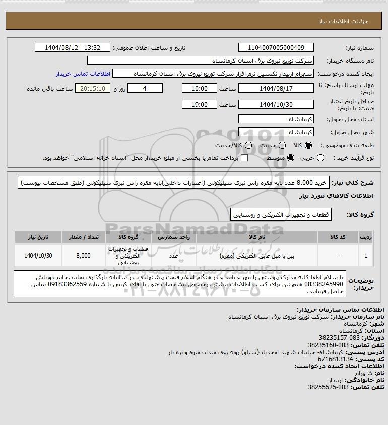 | 1 | -- | پین یا میل عایق الکتریکی (مقره) | عدد | قطعات و تجهیزات الکتریکی و روشنایی | 8,000 | 1404/10/30 |