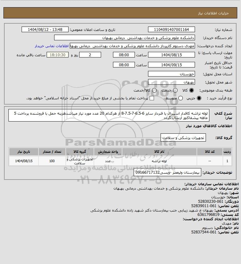 | 1 | -- | لوله تراشه | عدد | تجهیزات پزشکی و سلامت | 100 | 1404/08/15 |