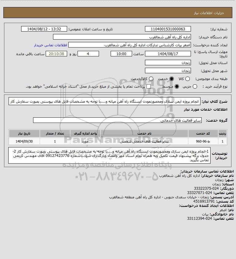 توضیحات خریدار:1-انجام پروژه ایمن سازی ومحصورنمودن ایستگاه راه آهن میانه و....با توجه به مشخصات فایل های پیوستی بصورت سفارش کار