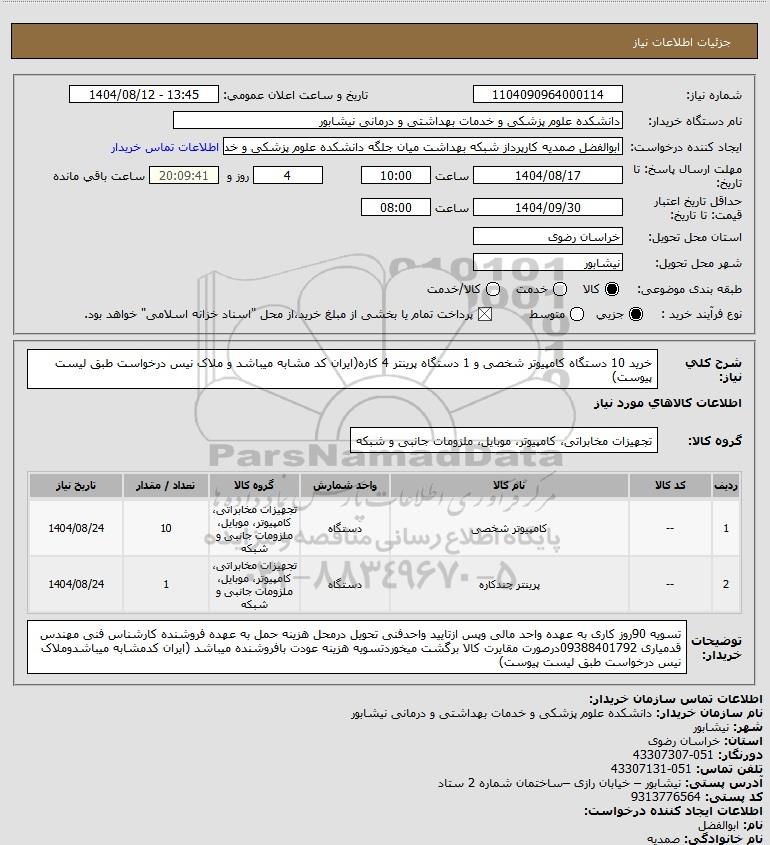 شرح کلی نیاز: خرید 10 دستگاه کامپیوتر شخصی و 1 دستگاه پرینتر 4 کاره(ایران کد مشابه میباشد و ملاک نیس درخواست طبق لیست پیوست)