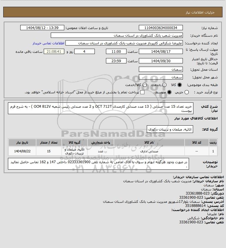 شرح کلی نیاز: خرید تعداد 15 عدد صندلی ( 13 عدد صندلی کارمندی OCT 712T و 2 عدد صندلی رئیس شعبه OCM 812V ) - به شرح فرم پیوست