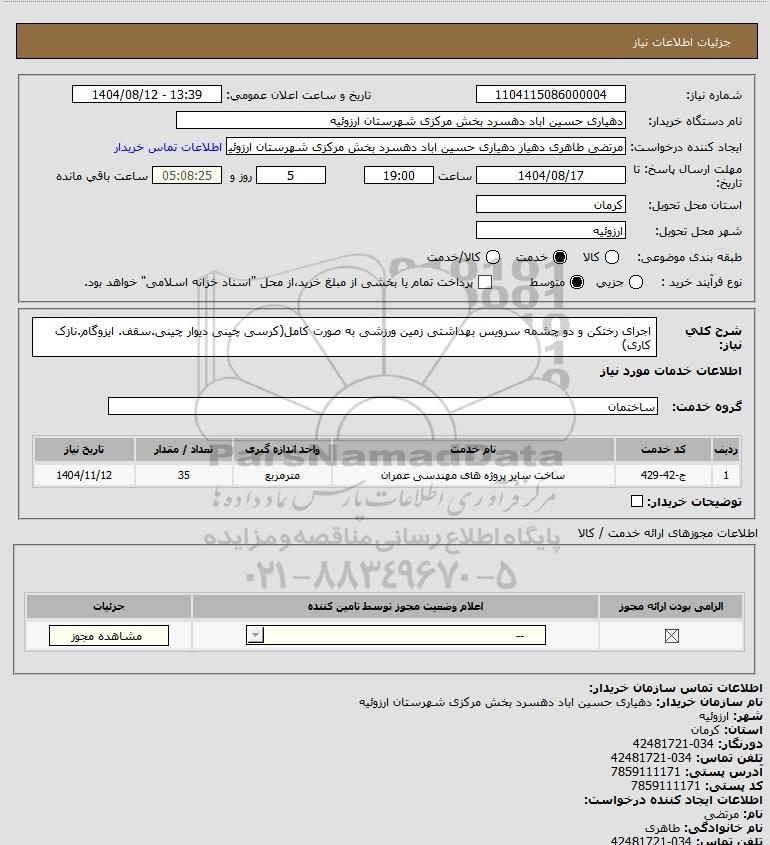 شرح کلی نیاز: اجرای رختکن و دو چشمه سرویس بهداشتی زمین ورزشی به صورت کامل(کرسی چینی دیوار چینی.سقف. ایزوگام.نازک کاری)
