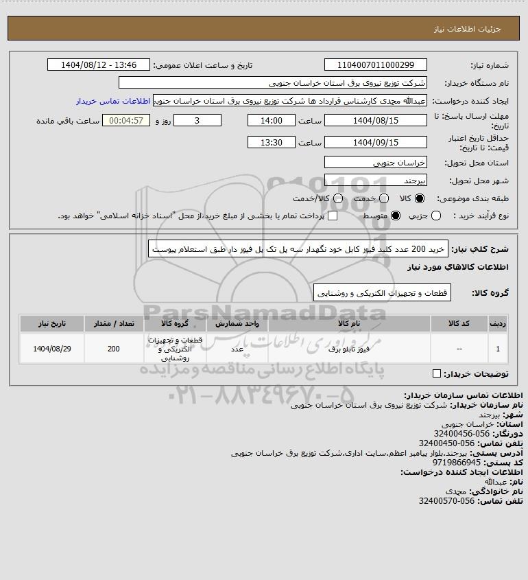 شرح کلی نیاز: خرید 200 عدد کلید فیوز کابل خود نگهدار سه پل تک پل فیوز دار طبق استعلام پیوست