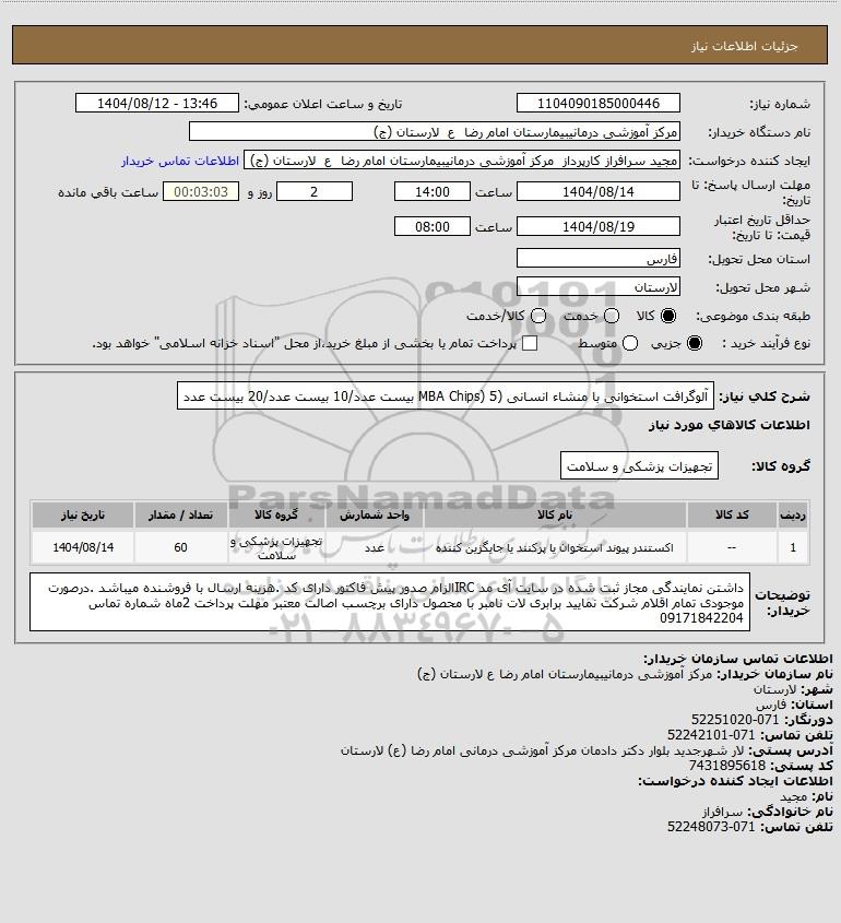 استعلام بها و موضوع استعلام استعلام آلوگرافت استخوانی با منشاء انسانی (MBA Chips) 5 بیست عدد/10 بیست عدد/20 بیست عدد به اطلاع کلیه شرکتها و افراد متخصص واجد شرایط میرساند، آگهی گذار در نظر دارد از طریق استعلام بها، نسبت به انتخاب و دریافت پیشنهادات اقدام نماید. این استعلام با کد آگهی ثبت شده در سامانه خبرگزاری پارس نماد : 9794162 منتشر شده است. مشخصات استعلام : تاریخ شروع استعلام: 1404/08/12 آخرین مهلت ارسال پیشنهاد قیمت : 1404/08/14 و محل اجرای پروژه : استان فارس میباشد. استعلام قیمت مورد درخواست : استعلام آلوگرافت استخوانی با منشاء انسانی (MBA Chips) 5 بیست عدد/10 بیست عدد/20 بیست عدد با دستهبندیهای تخصصی و گروه های مرتبط : خدمات و تجهیزات آزمایشگاهی و پزشکی, استعلام اطلاع رسانی میگردد.