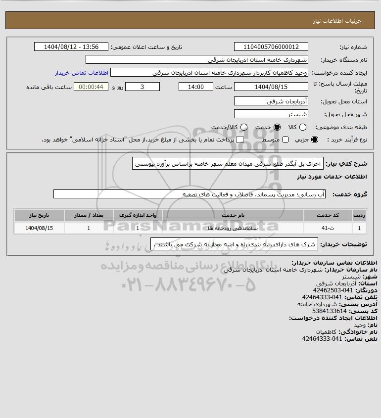 شرح کلی نیاز: اجرای پل آبگذر ضلع شرقی میدان معلم شهر خامنه براساس برآورد پیوستی