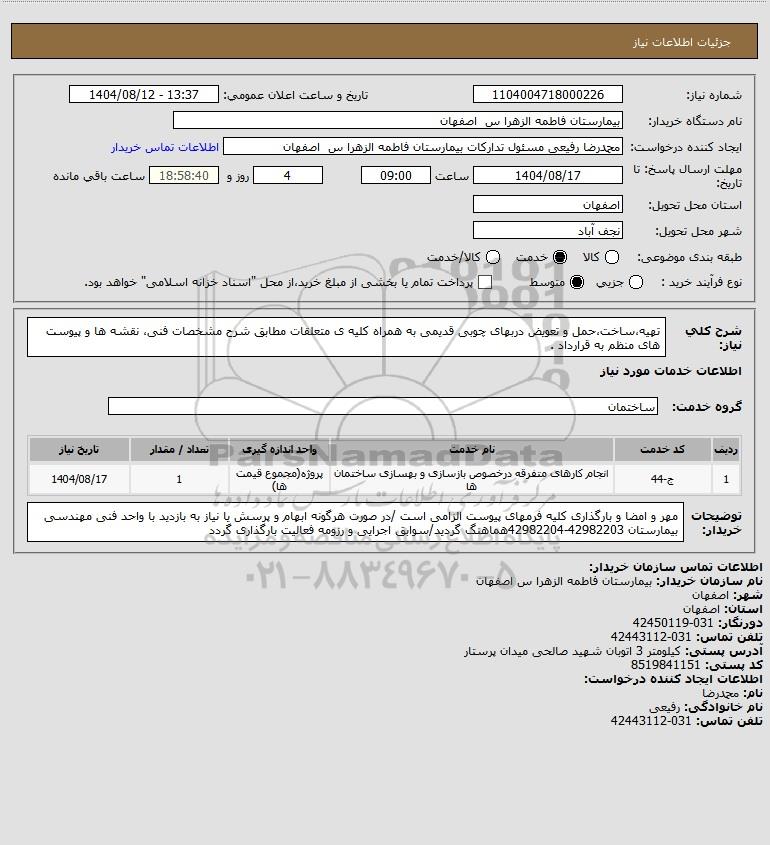 شرح کلی نیاز: تهیه،ساخت،حمل و تعویض دربهای چوبی قدیمی به همراه کلیه ی متعلقات مطابق شرح مشخصات فنی، نقشه ها و پیوست های منظم به قرارداد .