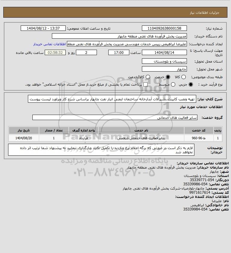 شرح کلی نیاز: تهیه ونصب کابینت ،شیرآلات آبدارخانه ساختمان ایمنی انبار نفت چابهار براساس شرح کار وبراورد لیست پیوست