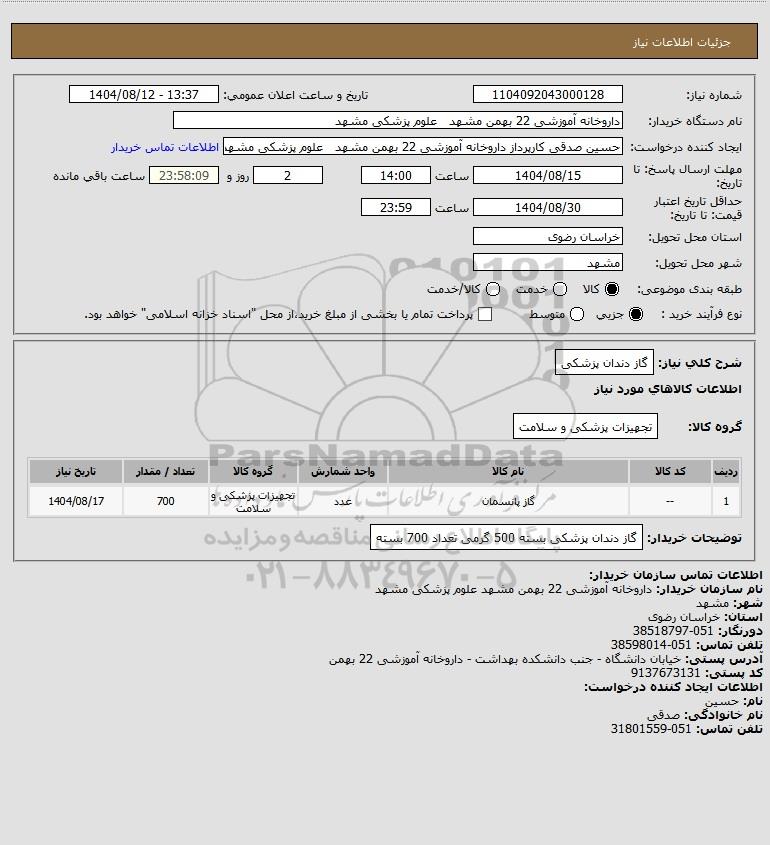 | 1 | -- | گاز پانسمان | عدد | تجهیزات پزشکی و سلامت | 700 | 1404/08/17 |