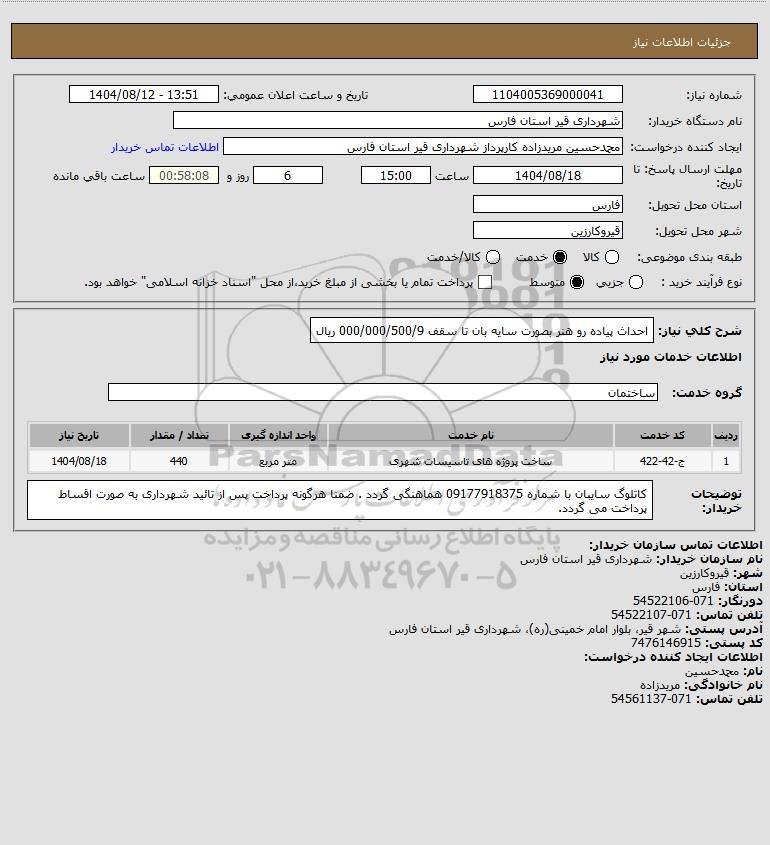 شرح کلی نیاز: احداث پیاده رو هنر بصورت سایه بان تا سقف 000/000/500/9 ریال