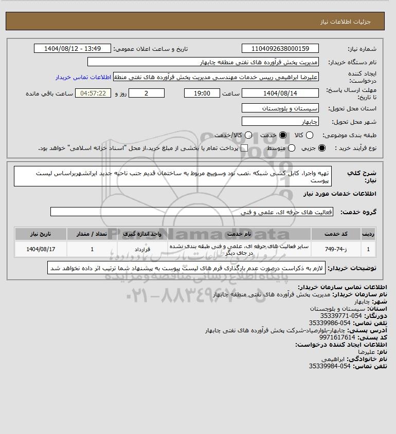 شرح کلی نیاز: تهیه واجرا، کابل کشی شبکه ،نصب نود وسوییچ مربوط به ساختمان قدیم جنب ناحیه جدید ایرانشهربراساس لیست پیوست