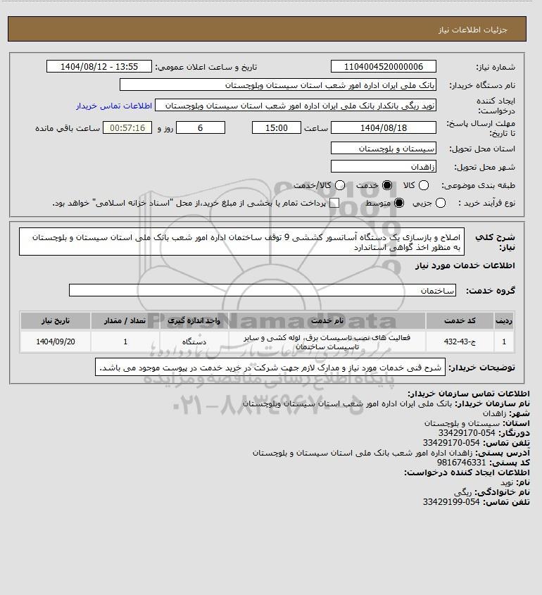 شرح کلی نیاز: اصلاح و بازسازی یک دستگاه آسانسور کششی 9 توقف ساختمان اداره امور شعب بانک ملی استان سیستان و بلوچستان به منظور اخذ گواهی استاندارد