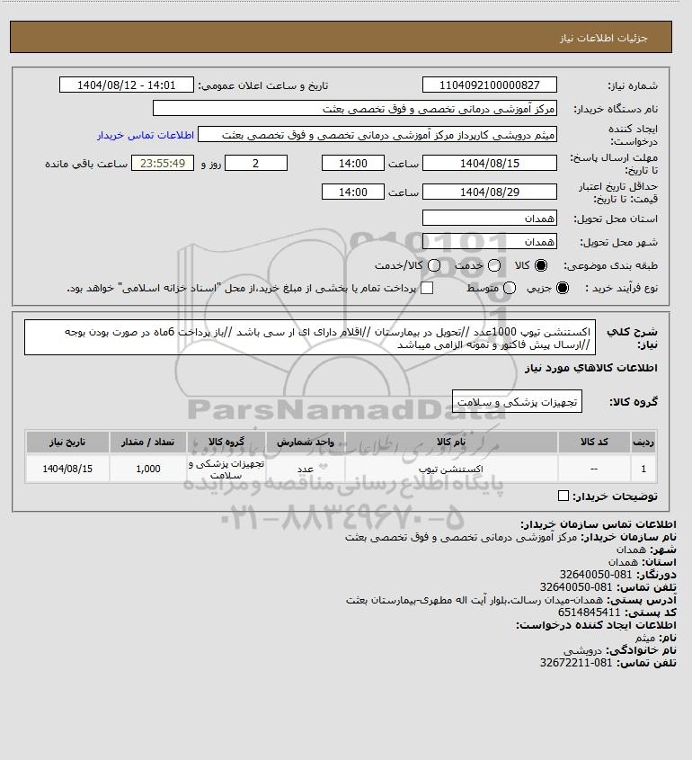 شرح کلی نیاز: اکستنشن تیوپ 1000عدد //تحویل در بیمارستان //اقلام دارای ای ار سی باشد //باز پرداخت 6ماه در صورت بودن بوجه //ارسال پیش فاکتور و نمونه الزامی میباشد