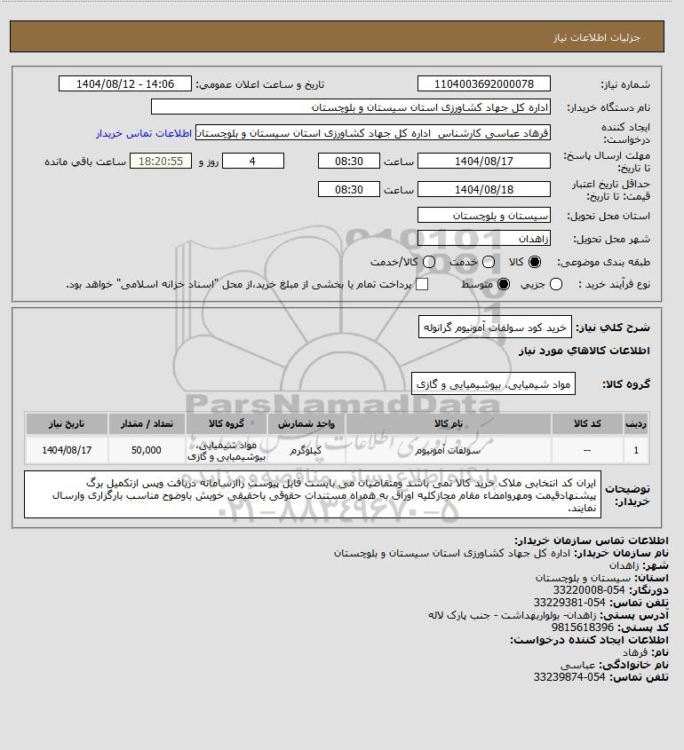 | 1 | -- | سولفات آمونیوم | کیلوگرم | مواد شیمیایی، بیوشیمیایی و گازی | 50,000 | 1404/08/17 |