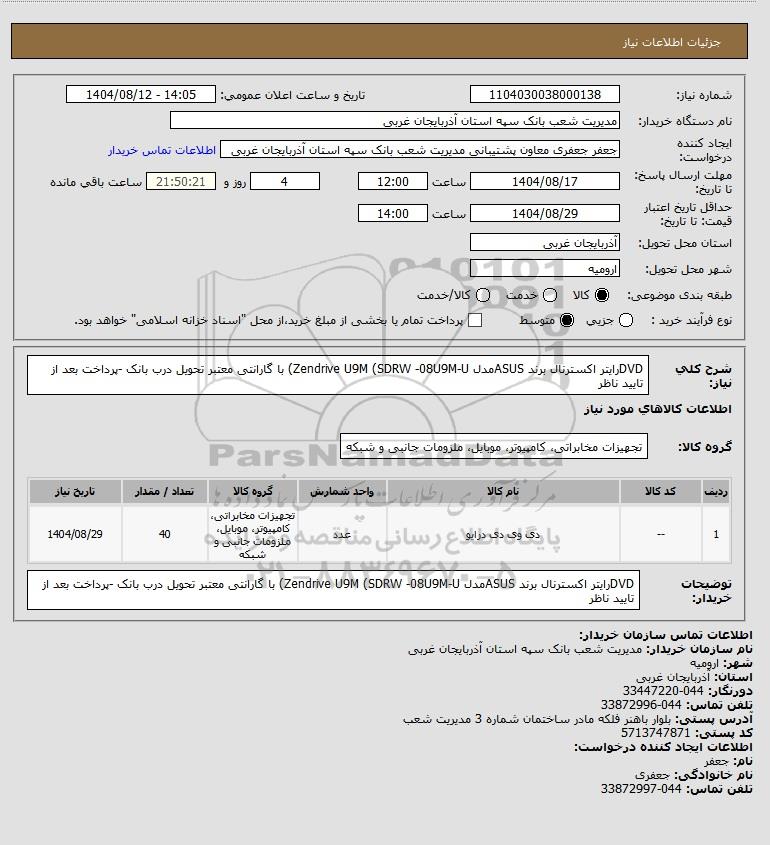 1 -- دی وی دی درایو عدد تجهیزات مخابراتی، کامپیوتر، موبایل، ملزومات جانبی و شبکه 40 1404/08/29
