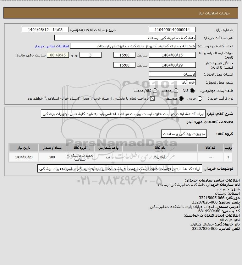 نام دستگاه خریدار:دانشکده دندانپزشکی لرستان