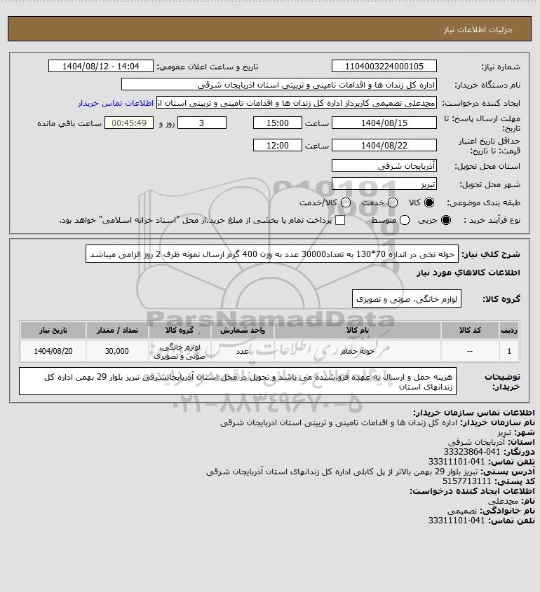 شرح کلی نیاز: حوله نخی در اندازه 70*130 به تعداد30000 عدد به وزن 400 گرم ارسال نمونه ظرف 2 روز الزامی میباشد