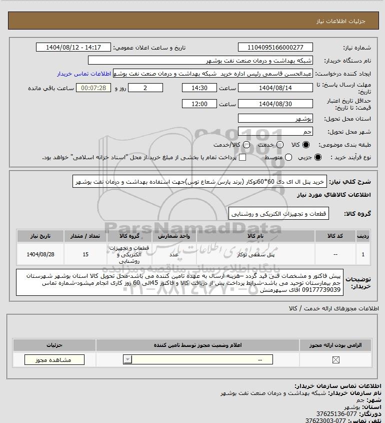 استعلام خرید پنل ال ای دی 60*60توکار (برند پارس شعاع توس)جهت استفاده بهداشت و درمان نفت بوشهر, استعلام خرید پنل ال ای دی 60*60توکار (برند پارس شعاع توس)جهت استفاده بهداشت و درمان نفت بوشهر