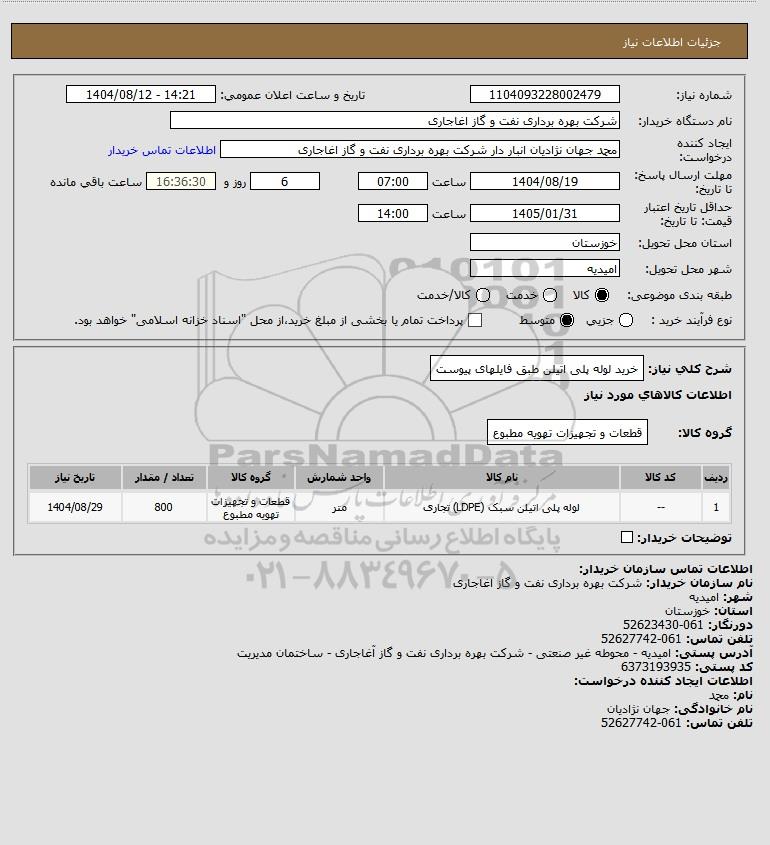 | 1 | -- | لوله پلی اتیلن سبک (LDPE) تجاری | متر | قطعات و تجهیزات تهویه مطبوع | 800 | 1404/08/29 |