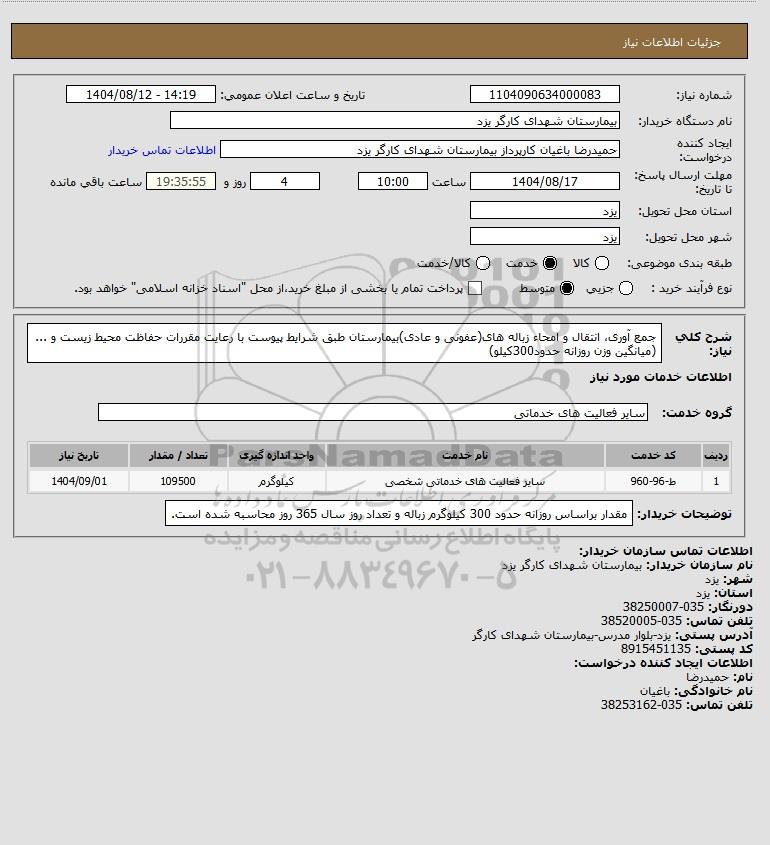 شرح کلی نیاز: جمع آوری، انتقال و امحاء زباله های(عفونی و عادی)بیمارستان طبق شرایط پیوست با رعایت مقررات حفاظت محیط زیست و ...(میانگین وزن روزانه حدود300کیلو)