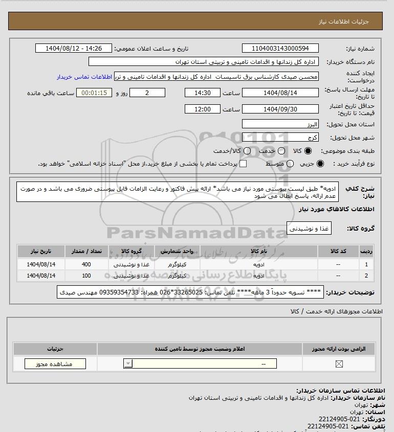 استعلام بها و موضوع استعلام استعلام ادویه* طبق لیست پیوستی مورد نیاز می باشد* ارائه پیش فاکتور و رعایت الزامات فایل پیوستی ضروری می باشد و در صورت عدم ارائه، پاسخ ابطال می شود به اطلاع کلیه شرکتها و افراد متخصص واجد شرایط میرساند، آگهی گذار در نظر دارد از طریق استعلام بها، نسبت به انتخاب و دریافت پیشنهادات اقدام نماید. این استعلام با کد آگهی ثبت شده در سامانه خبرگزاری پارس نماد : 9794633 منتشر شده است. مشخصات استعلام : تاریخ شروع استعلام: 1404/08/12 آخرین مهلت ارسال پیشنهاد قیمت : 1404/08/14 و محل اجرای پروژه : استان البرز میباشد. استعلام قیمت مورد درخواست : استعلام ادویه* طبق لیست پیوستی مورد نیاز می باشد* ارائه پیش فاکتور و رعایت الزامات فایل پیوستی ضروری می باشد و در صورت عدم ارائه، پاسخ ابطال می شود با دستهبندیهای تخصصی و گروه های مرتبط : مواد غذایی, استعلام اطلاع رسانی میگردد.
