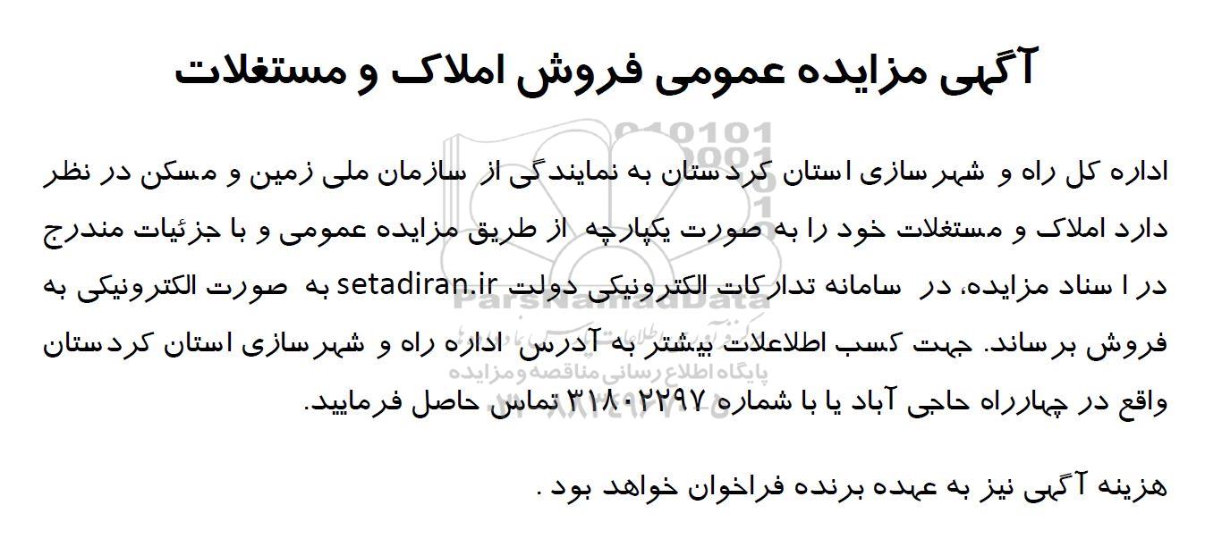 اداره کل راه و شهرسازی استان کردستان به نمایندگی از سازمان ملی زمین و مسکن در نظر دارد املاک و مستغلات خود را به صورت یکپارچه از طریق مزایده عمومی و با جزئیات مندرج در اسناد مزایده در سامانه تدارکات الکترونیکی دولت ستاد ایران به صورت الکترونیکی به فروش برساند.