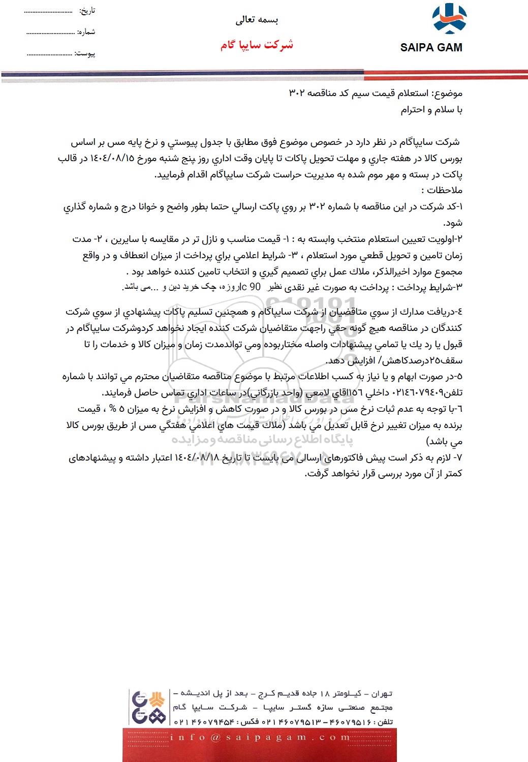 موضوع: استعلام قیمت سیم که مناقصه 302