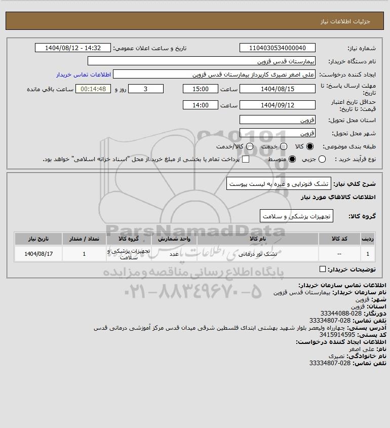 | 1 | -- | تشک نور درمانی | عدد | تجهیزات پزشکی و سلامت | 1 | 1404/08/17 |