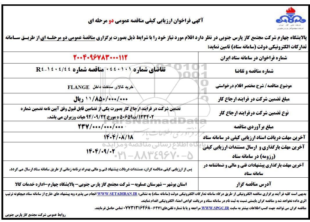 پالایشگاه چهارم شرکت مجتمع گاز پارس جنوبی در نظر دارد اقلام مورد نیاز خود را با شرایط ذیل بصورت برگزاری مناقصه عمومی دو مرحله ای از طریق سامانه تدارکات الکترونیکی دولت (سامانه ستاد) تامین نماید: