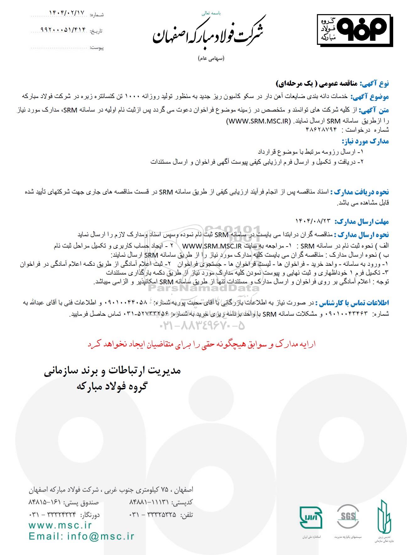 موضوع آگهی: خدمات دانه بندی ضایعات آهن دار در سکو کامیون ریز جدید به منظور تولید روزانه 1000 تن کنسانتره زبره در شرکت فولاد مبارکه