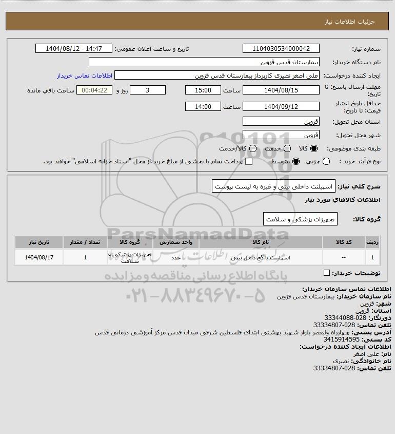 استعلام بها و موضوع استعلام استعلام اسپیلنت داخلی بینی و غیره به لیست پیوست به اطلاع کلیه شرکتها و افراد متخصص واجد شرایط میرساند، آگهی گذار در نظر دارد از طریق استعلام بها، نسبت به انتخاب و دریافت پیشنهادات اقدام نماید. این استعلام با کد آگهی ثبت شده در سامانه خبرگزاری پارس نماد : 9794767 منتشر شده است. مشخصات استعلام : تاریخ شروع استعلام: 1404/08/12 آخرین مهلت ارسال پیشنهاد قیمت : 1404/08/15 و محل اجرای پروژه : استان قزوین میباشد. استعلام قیمت مورد درخواست : استعلام اسپیلنت داخلی بینی و غیره به لیست پیوست با دستهبندیهای تخصصی و گروه های مرتبط : خدمات و تجهیزات آزمایشگاهی و پزشکی, استعلام اطلاع رسانی میگردد.