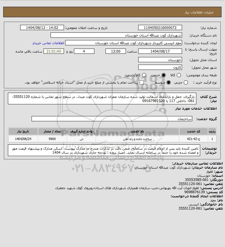 شرح کلی نیاز: بارگیری، حمل و باراندازی آسفالت تولید شده سازمان عمران شهرداری کوت عبدا.. در سطح شهر