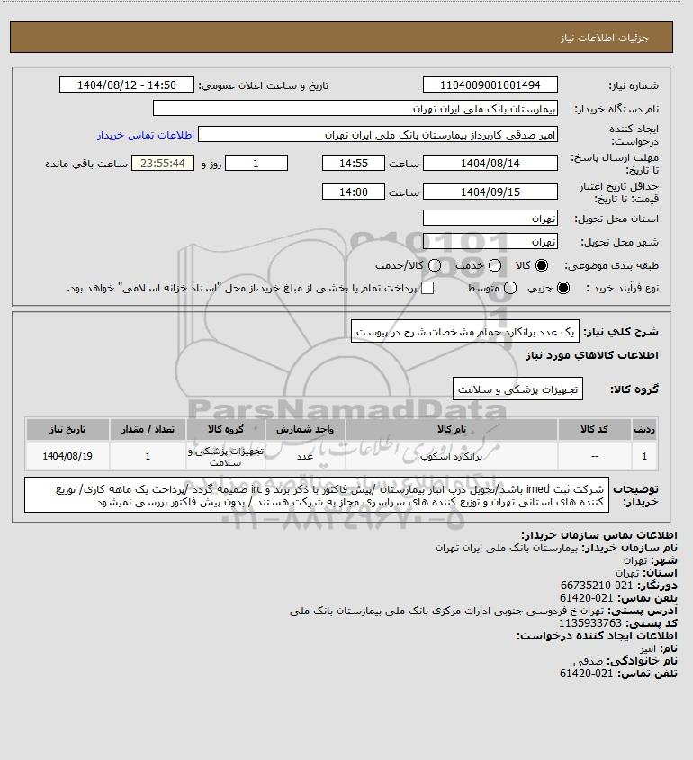 نام سازمان خریدار: بیمارستان بانک ملی ایران تهران