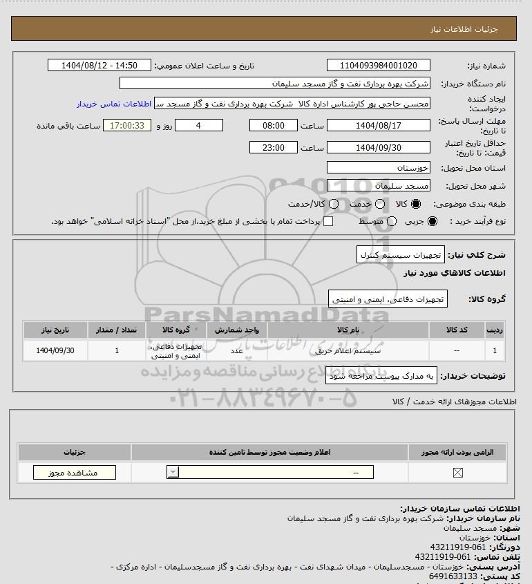 شرح کلی نیاز: تجهیزات سیستم کنترل