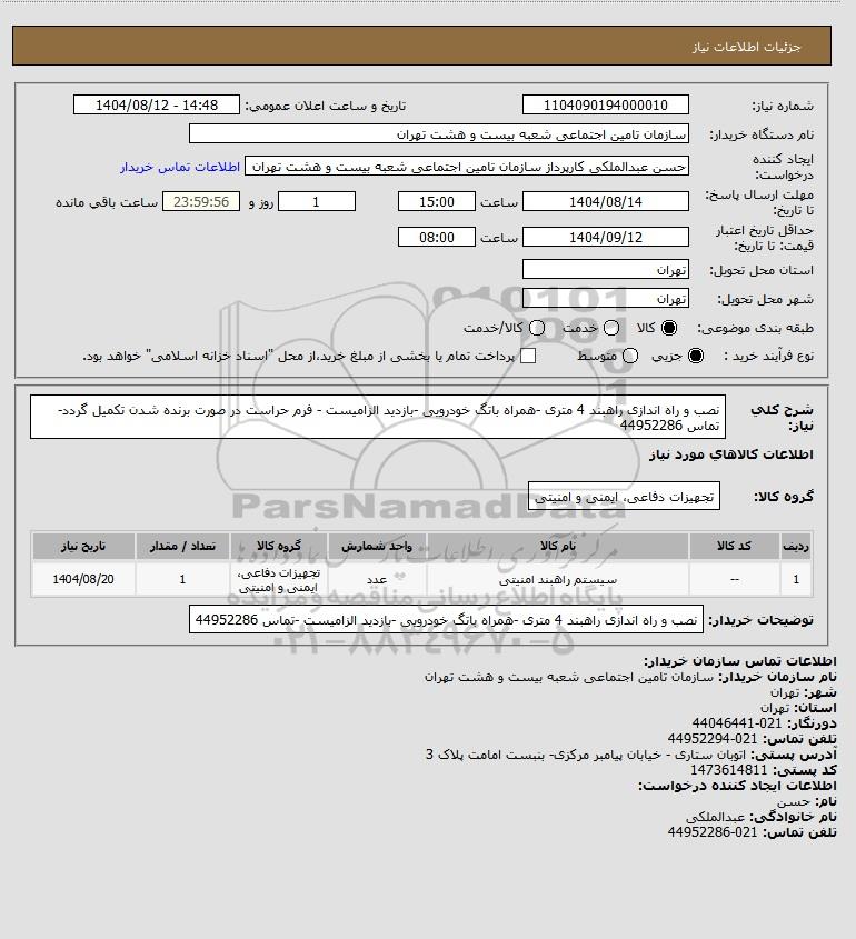 شرح کلی نیاز: نصب و راه اندازی راهبند 4 متری -همراه باتگ خودرویی -بازدید الزامیست - فرم حراست در صورت برنده شدن تکمیل گردد-تماس 44952286