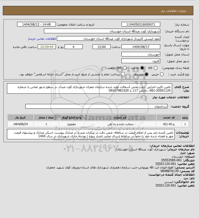 شرح کلی نیاز: تامین اکیپ اجرایی جهت پخش آسفالت تولید شده سازمان عمران شهرداری کوت عبدا.. در سطح شهر