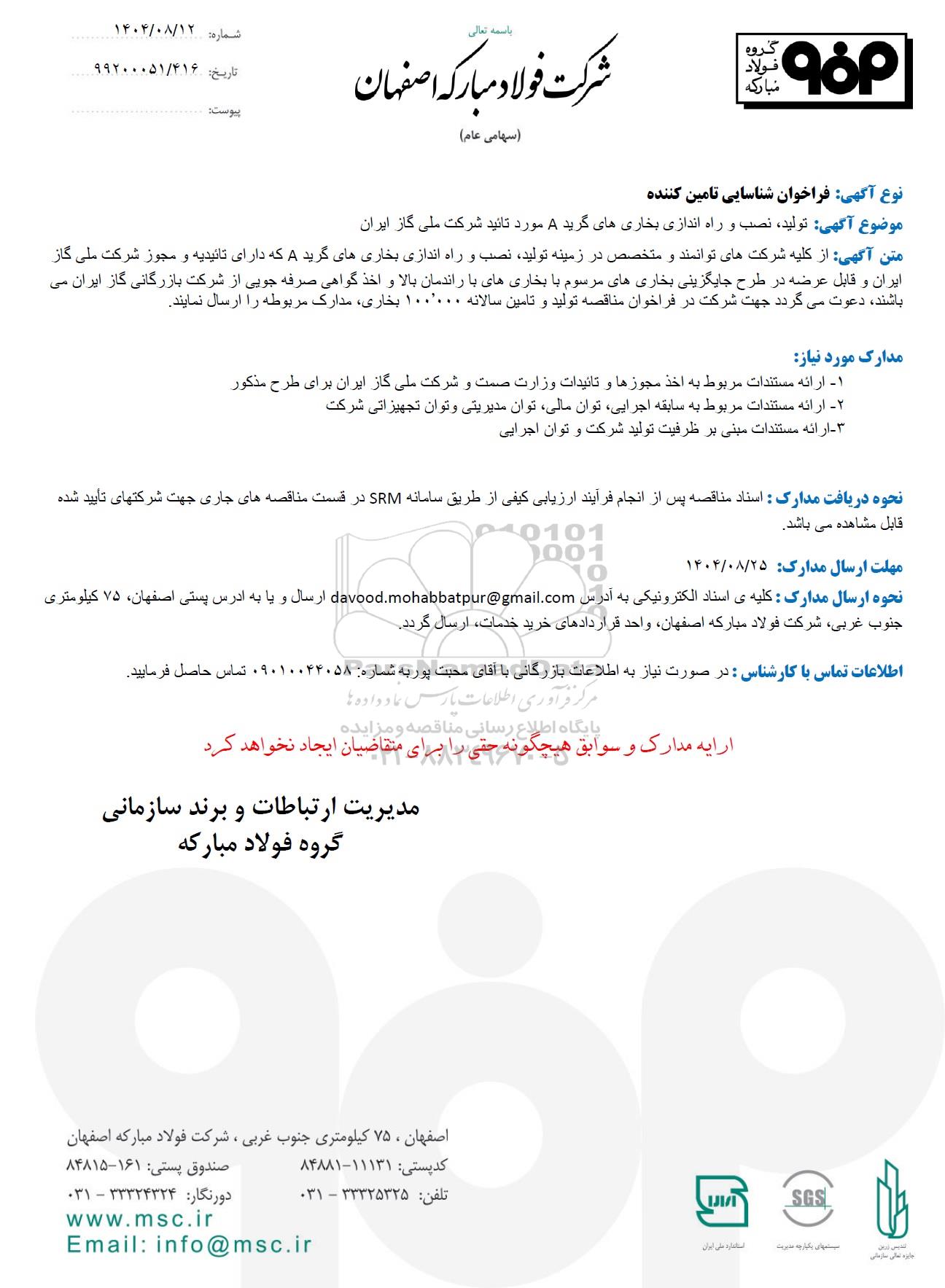 موضوع آگهی: تولید، نصب و راه اندازی بخاری های گرید A مورد تائید شرکت ملی گاز ایران