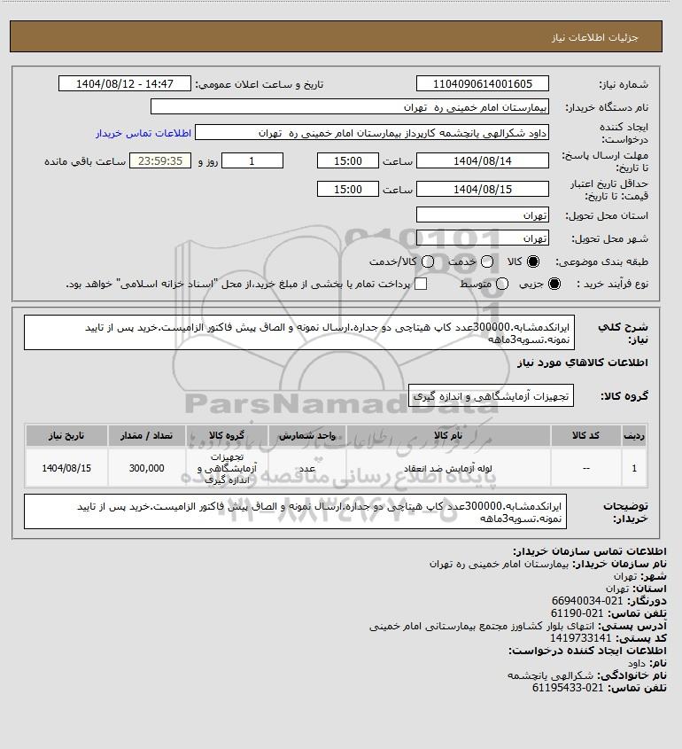 استعلام بها و موضوع استعلام استعلام ایرانکدمشابه.300000عدد کاپ هیتاچی دو جداره.ارسال نمونه و الصاق پیش فاکتور الزامیست.خرید پس از تایید نمونه.تسویه3ماهه به اطلاع کلیه شرکت‌ها و افراد متخصص واجد شرایط می‌رساند، آگهی گذار در نظر دارد از طریق استعلام بها، نسبت به انتخاب و دریافت پیشنهادات اقدام نماید. این استعلام با کد آگهی ثبت شده در سامانه خبرگزاری پارس نماد : 9794858 منتشر شده است. مشخصات استعلام : تاریخ شروع استعلام: 1404/08/12 آخرین مهلت ارسال پیشنهاد قیمت : 1404/08/14 و محل اجرای پروژه : استان تهران میباشد. استعلام قیمت مورد درخواست : استعلام ایرانکدمشابه.300000عدد کاپ هیتاچی دو جداره.ارسال نمونه و الصاق پیش فاکتور الزامیست.خرید پس از تایید نمونه.تسویه3ماهه با دسته‌بندی‌های تخصصی و گروه های مرتبط : خدمات و تجهیزات آزمایشگاهی و پزشکی, استعلام اطلاع رسانی میگردد.
